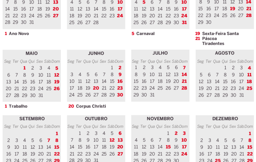 5 de março (terça): Carnaval — a segunda-feira, 4 de março, é ponto facultativo, bem como a quarta-feira de Cinzas (ponto facultativo até as 14h)
