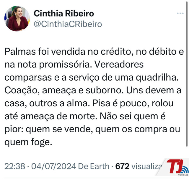 A prefeita Cinthia Ribeiro Mantoan usou seu pefil no Twiter, rede X, para reagir à votação que derrubou os três projetos de lei. "Palmas foi vendida no crédio, no débito e na nota promissória. Veradores comparsas a serviço de uma quadrilha. Coação, ameaça e suborno. Uns devem a casa, outros a alma. Pisa é pouco rolou até ameaça de morte. Não msei quem é pior: quem se vende, quem os compra ou quem foge". Ela não detalhou a quem se referia.