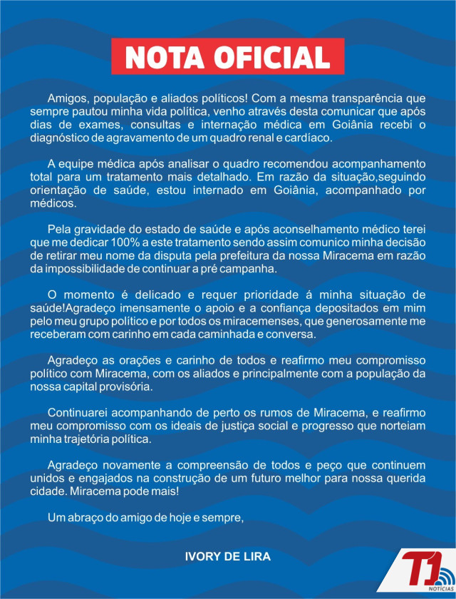 O deputado estadual Ivory de Lira (PCdoB) desistiu de sua pré-candidatura a prefeito de Miracema para tratamento de saúde. Internado em Goiânia, Ivory anunciou a decisão em nota divulgada na noite desta terça-feira, 9. A pré-candidata a vice-prefeita, Andréa Bucar (PP), acompanhou a decisão e também retirou seu nome.