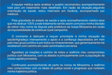 "Pela gravidade do estado de saúde e após aconselhamento médico terei que me dedicar 100% a este tratamento (...) o momento é delicado e requer prioridade à minha situação de saúde. Agradeço imensamente o apoio e a confiança depositados em mim pelo meu grupo político e por todos os miracemenses, que generosamente me receberam em cada caminhada e conversa", ressaltou.