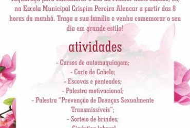 Serão oferecidas diversas atividades para as mulheres da região, como cursos de automaquiagem, corte e escova de cabelo, palestras e sorteio de brindes. Para Negreiros é de extrema importância proporcionar às mulheres um evento como este.