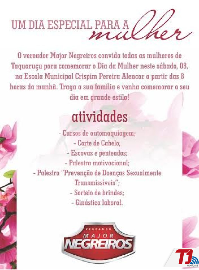 O presidente da Câmara de Palmas, vereador Major Negreiros (PP), parabenizou na manhã desta sexta-feira, 7, as mulheres da Casa pelo Dia Internacional da Mulher. A data oficial, que marca a luta das mulheres pelo direito à igualdade de oportunidades, é dia 8 de março. Para festejar em grande estilo, Negreiros organizou um evento especial neste sábado, 8, a partir das 8 horas da manhã, na Escola Municipal Crispim Pereira Alencar, em Taquaruçu.