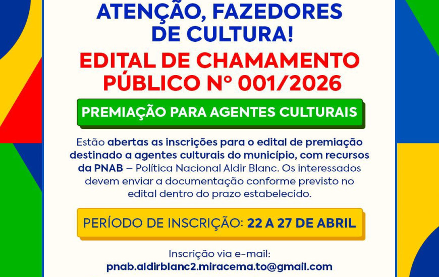 As inscrições para o Edital de Chamamento Público nº 001/2026 já estão abertas e seguem até o dia 27 de abril. A iniciativa é da Prefeitura de Miracema do Tocantins, por meio da Secretaria Municipal do Desenvolvimento Econômico, Cultura e Turismo, com foco em premiar quem faz a cultura acontecer na cidade. O objetivo é reconhecer a trajetória de agentes culturais, coletivos e instituições que comprovem atuação no município há, no mínimo, dois anos.