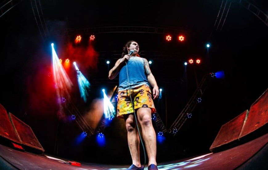 Logo em seguida Whindersson subiu ao palco e foi recebido com animação pelo público. O novo repertório traz piadas sobre o período em que ele ficou em casa se recuperando de uma depressão e das viagens que ele já fez pelo mundo com a nova turnê.