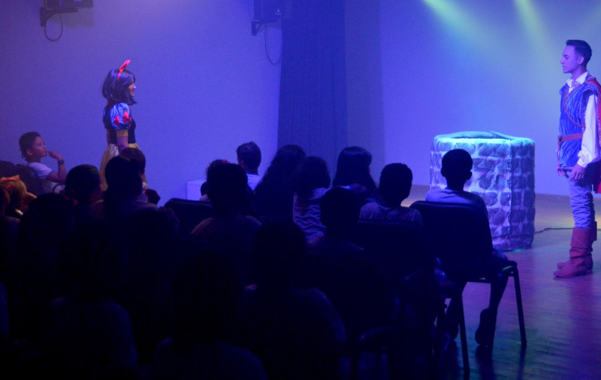 Antes de conhecer a sala de teatro, as crianças participaram de uma roda onde elas contaram suas próprias versões das histórias clássicas: Rapunzel, Branca de Neve ou a história do Macaquinho, com incentivo do projeto Conecta Biblioteca, programa nacional de estímulo à transformação social por meio de bibliotecas públicas. Aberta à comunidade, a biblioteca fica disponível a partir das 8 horas.