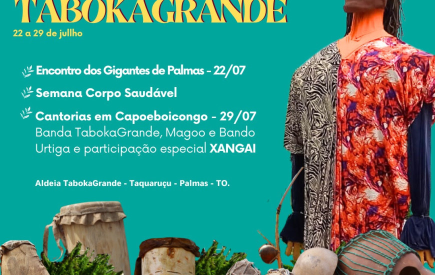 No próximo fim de semana a na Praça Maracaípe, terá início a Festa TabokaGrande 2023. O evento acontece de 22 a 29 de julho, com encontro dos bonecos Gigantes de Palmas e uma semana de vivência e experiências naturais.