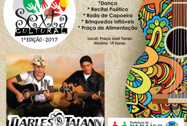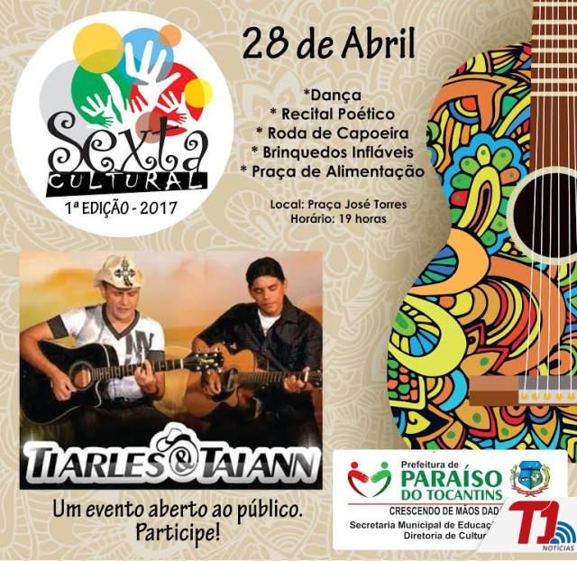 Tradicionalmente lembrada por atrair grande público, oferecer gratuitamente boa música e atrações artísticas diversas, a Sexta Cultural de Paraíso do Tocantins retoma suas atividades nesta sexta-feira, 28, na Praça José Ribeiro Torres, com apresentação dos músicos Tiarles e Taiann. Com início às 19 horas a programação da Sexta Cultura também conta com dança, recital poético e roda de capoeira. Há ainda serviço de praça de alimentação e brinquedos infláveis para crianças. O evento é organizado pela Prefeitura de Paraíso do Tocantins, por meio da Secretaria de Educação e Cultura.