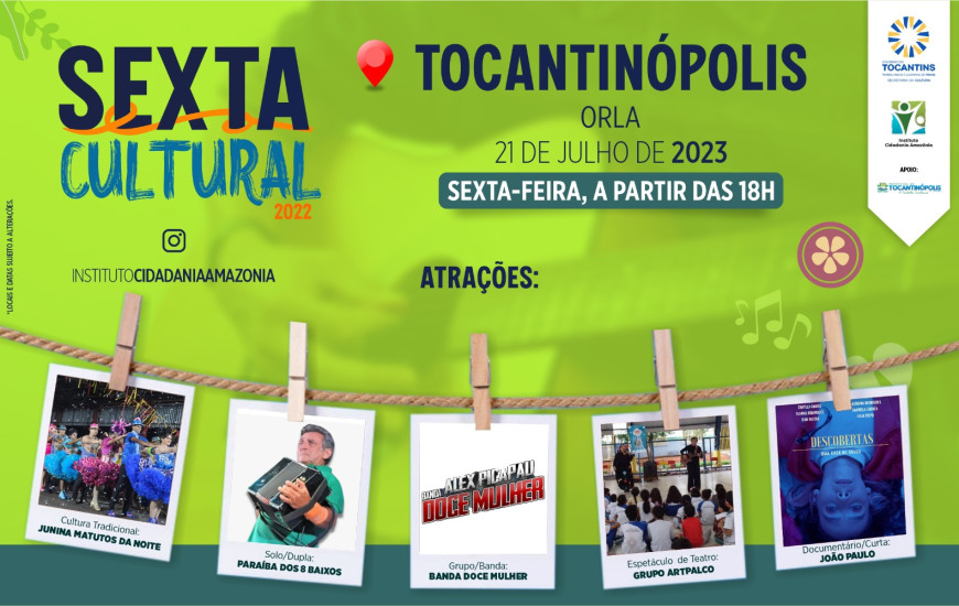 A Secretaria da Cultura (Secult), em parceria com o Instituto Cidadania Amazônia, realiza nesta sexta-feira, 21, no município de Tocantinópolis, extremo norte do Tocantins, mais uma edição do projeto Sexta Cultural. O evento acontecerá na orla da cidade e contará com cinco atrações artísticas, que se apresentarão gratuitamente para a população.