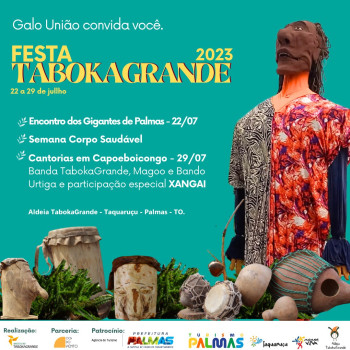 No próximo dia 22 tem início a programação da Festa TabokaGrande 2023, a abertura será realizada com o Encontro dos bonecos "Gigantes de Palmas", na Aldeia TabokaGrande e segue com uma semana de vivências e experiências naturais, encerrar&aacu...