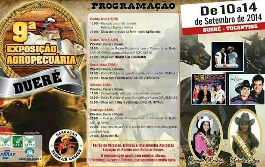 Nesta quinta-feira 11, a partir das 20h, acontece no Parque de Exposição Agropecuário de Dueré, a IX Expo Dueré, o presidente da Federação da Agricultura e Pecuária do Estado do Tocantins (FAET) e do Serviço Nacional de Aprendizagem Rural do Tocantins (SENAR), Edmar Corrêa Oliveira, participa da abertura oficial. A apresentação do rodeio será realizada pela Companhia Carlos Naves e a participação do locutor Sidimar Gomes, além do show da dupla sertaneja Igor e Alessandro.