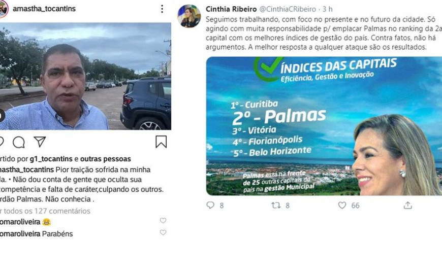 Sobre as críticas ácidas do ex-prefeito, Cinthia Ribeiro não respondeu diretamente, mas postou no seu perfil do Instagram e no Twitter uma resposta comedida. Disse: “seguimos trabalhando, com foco no presente e no futuro da cidade. Só agindo com muita responsabilidade para emplacar Palmas no ranking da 2ª capital com os melhores índices de gestão do Pais. Contra fatos, não há argumentos”.