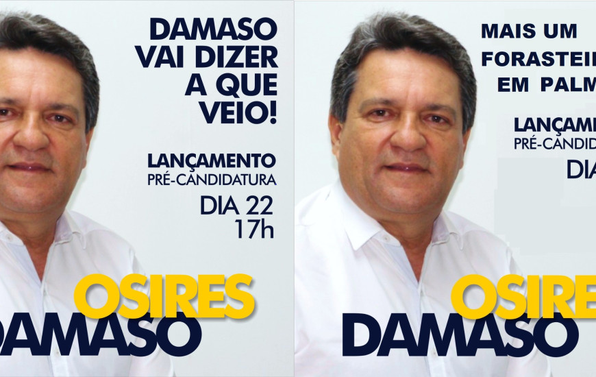 O deputado federal Osires Damaso (PSC) quer mesmo ser candidato a prefeito de Palmas, e anuncia sua pré-candidatura nesta quarta-feira, às 17hs, nas suas plataformas digitais. Recebi ontem uma nota da assessoria de comunicação do deputado, que é de Paraíso, mas transferiu - como tantos – seu título eleitoral para Palmas aproveitando-se do vácuo deixado pelo recuo do vice-governador Wanderley Barbosa em disputar o comando da capital.