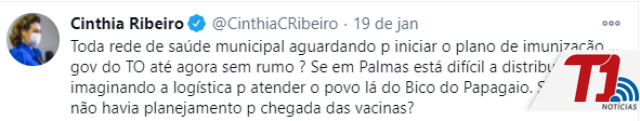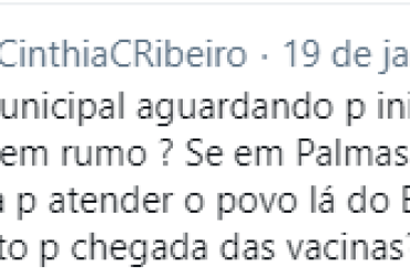 A rede mais política de todas, o Twitter, virou caixa de repercussão na tarde de ontem, 19, da insatisfação da prefeita de Palmas, Cinthia Ribeiro, com o que ela considerou demora injustificada na entrega das vacinas Coronavac à equipe da Saúde do Município para começo da campanha de vacinação na Capital contra a Covid-19.