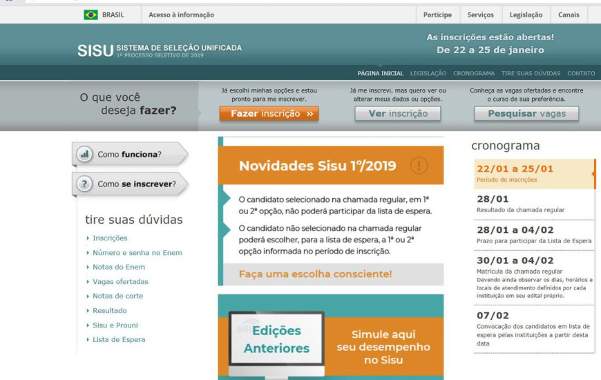 Ao todo, o Sisu oferece, nesta edição, 235.461 vagas em 129 instituições públicas de todo o país. Puderam se inscrever no programa os estudantes que fizeram o Enem 2018 e obtiveram nota acima de zero na prova de redação. Segundo o MEC, 3,5 milhões de estudantes preencheram os requisitos.