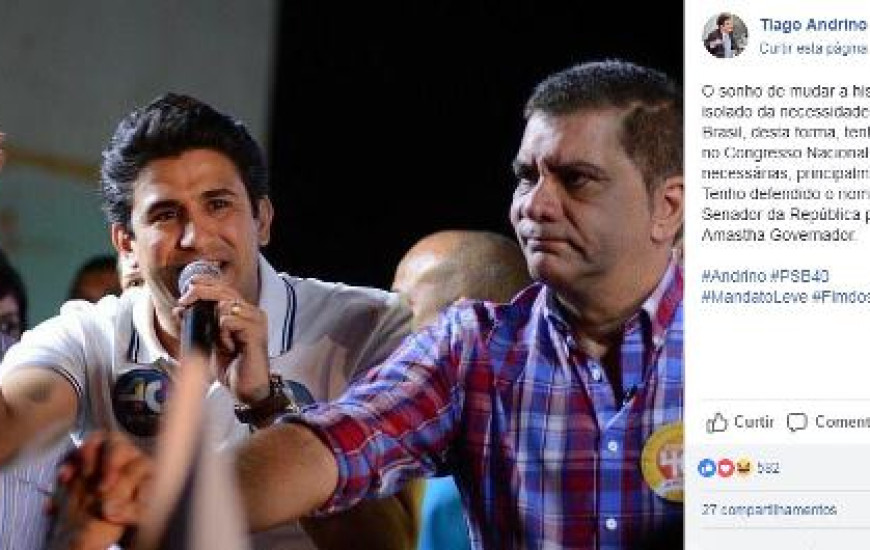 Em uma publicação postada na rede social Facebook, nesta quinta-feira, 25, o vereador de Palmas Tiago Andrino (PSB) manifestou apoio à candidatura do deputado estadual Alan Barbiero (PSB) ao Senado Federal. O parlamentar palmense diz que tem “defendido uma renovação no Congresso Nacional, para fazermos as reformas necessárias, principalmente, a do fim dos privilégios. Tenho defendido o nome do Prof. Alan Barbiero para Senador da República pelo PSB, junto com Amastha Governador". De acordo com informações repassadas pelo prefeito de Palmas, Carlos Amastha (PSB), durante coletivas de impressa, Andrino é possível nome para disputar uma vaga na Assembleia Legislativa.