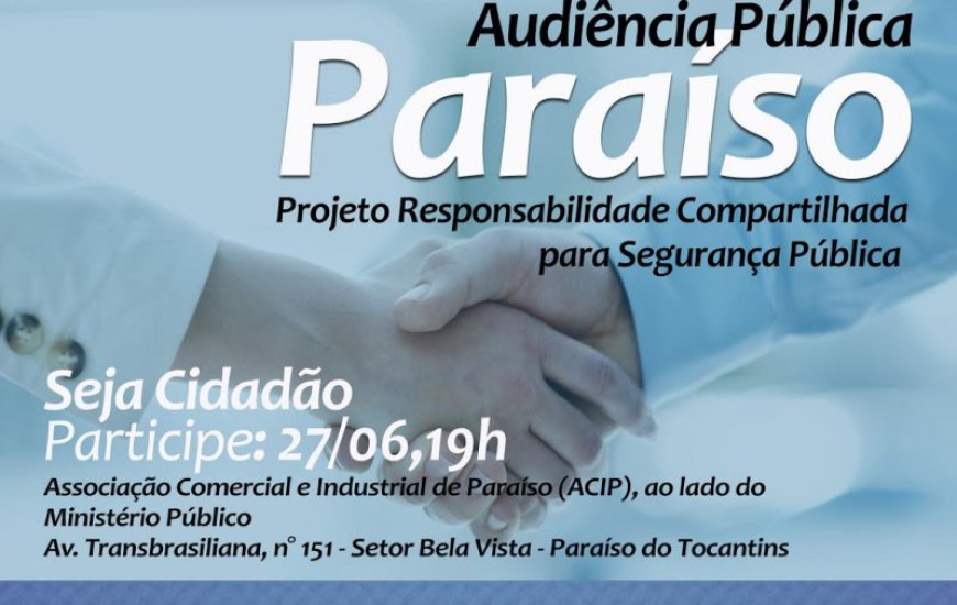 A audiência pública do Projeto de Responsabilidade Compartilhada para a Segurança Pública acontece hoje, 27, em Paraíso do Tocantins, às 19h, na Associação Comercial e Industrial de Paraíso (Acipa), no Setor Bela Vista. A ação é uma parceria entre a Assembleia Legislativa e a Ordem dos Advogados do Brasil (OAB/TO), e atende a um requerimento da deputada estadual Luana Ribeiro (PDT), presidente da Comissão de Segurança Pública. Antes da audiência, a partir das 17h, a equipe técnica da OAB e a deputada vão visitar as delegacias da cidade e o presídio. As audiências públicas visam ouvir as demandas da população para apresentar propostas simples e viáveis para a segurança pública, que devem ser incluídas no orçamento de 2017. As audiências já foram realizadas em Porto Nacional, Dianópolis e Araguaína.