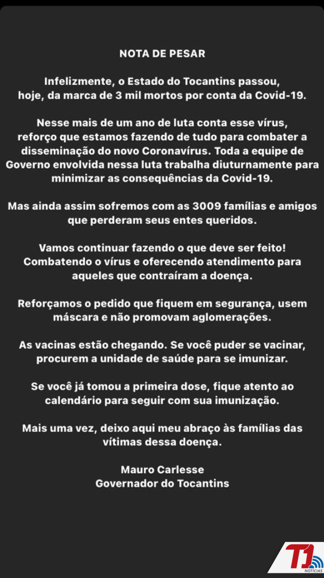 Neste sábado, 12, o governador Mauro Carlesse (PSL) transmitiu seus sentimentos às famílias das vítimas da Covid-19 no Tocantins. O Estado do Tocantins passou ontem da marca de 3 mil mortos em decorrência da doença. “Nesse mais de um ano de luta contra esse vírus, reforçamos que estamos fazendo de tudo para combater a disseminação do novo Coronavírus. Toda a equipe de Governo envolvida nessa luta, trabalha diuturnamente para minimizar as consequências da Covid-19” lamentou Carlesse. No comunicado, Carlesse também mencionou o pedido para que os tocantinenses fiquem em segurança, usem máscara e não promovam aglomerações. “As vacinas estão chegando. Se você puder se vacinar, procure a unidade de saúde para se imunizar” manifestou ainda.