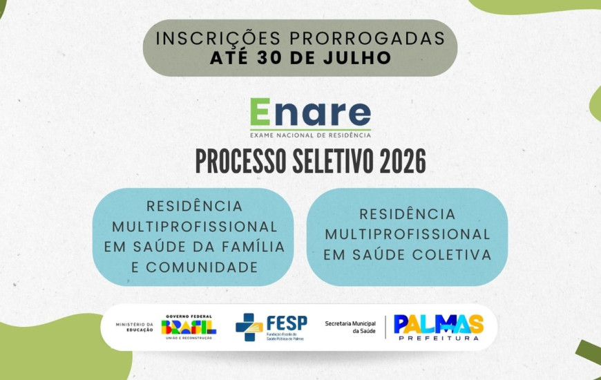As inscrições para o Exame Nacional de Residência (Enare) foram prorrogadas até 30 de julho. A Fundação Escola de Saúde Pública de Palmas (Fesp) oferta 67 vagas nos Programas de Residência Multiprofissional, com oportunidades em Saúde da Família e Comunidade e Saúde Coletiva, destinadas a diversas áreas da saúde. A taxa de inscrição é de R$ 220.