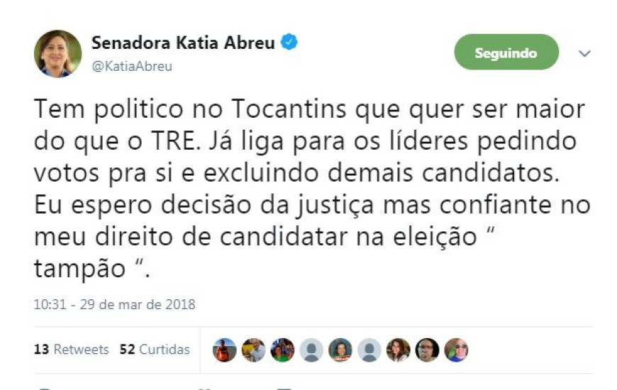 A senadora Kátia Abreu que irá se filiar ao PDT na próxima segunda-feira, 2 de abril, alfinetou adversários em sua conta no Twitter sobre a corrida para governador nas eleições de junho. "Tem politico no Tocantins que quer ser maior do que o TRE. Já liga para os líderes pedindo votos pra si e excluindo demais candidatos. Eu espero decisão da justiça, mas confiante no meu direito de candidatar na eleição "tampão"", diz.