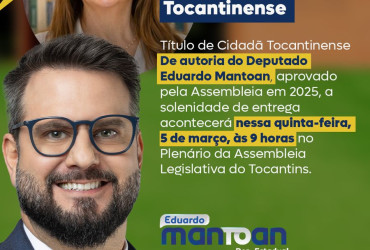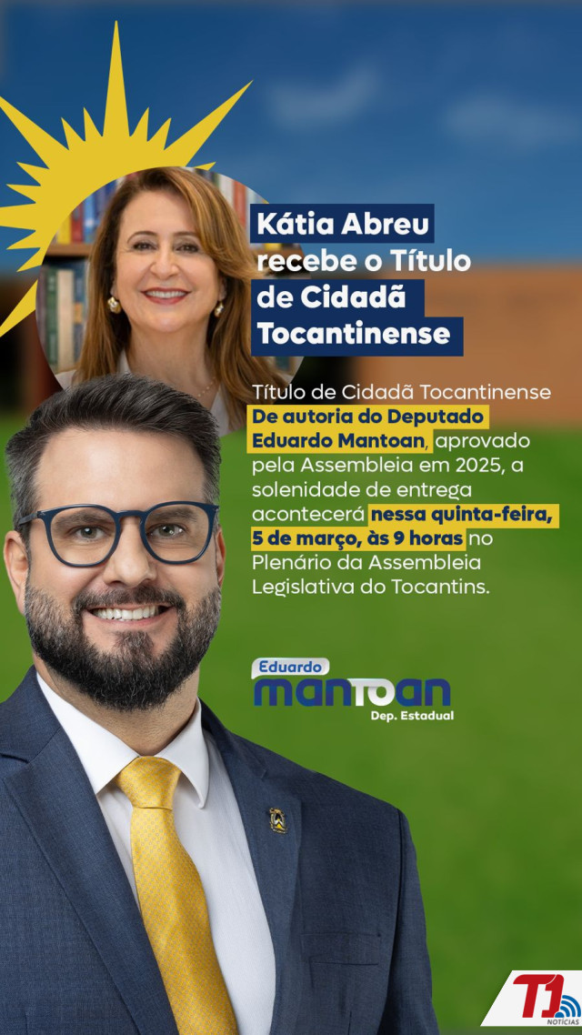 A ex-senadora Kátia Abreu recebe nesta quinta-feira, 5, as 9 horas, o título de Cidadã Tocantinense em sessão solene na Assembleia Legislativa do Tocantins (Aleto), em Palmas. A honraria, proposta pelo deputado estadual Eduardo Mantoan (PSDB) em 2024, reconhece formalmente a trajetória da líder política que, embora natural de Goiânia, dedicou décadas de vida pública ao estado. O parlamentar justifica a homenagem destacando a contribuição de Kátia para o desenvolvimento econômico regional e sua projeção nacional como defensora do agronegócio. Durante a cerimônia, serão celebrados marcos como sua atuação na presidência da CNA e seu mandato como Ministra da Agricultura.