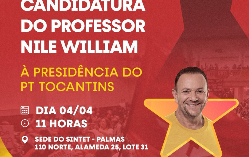 O pré-candidato à presidência da regional do Partido dos Trabalhadores (PT) no Tocantins, professor Nile William, participa nesta sexta-feira, 4, às 11 horas, na sede do Sindicato dos Trabalhadores em Educação do Tocantins (Sintet), na Arne 14 (110 Norte), da entrevista coletiva com o candidato à presidência nacional do PT, o ex-prefeito de Araraquara (SP), Edinho Silva.