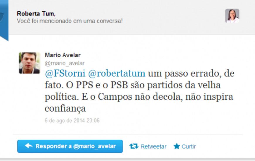 Mário Lúcio Avelar se arrependeu da escolha que fez ao trocar o PSOL pelo PPS. Em sua página no Twitter, o procurador federal respondeu ao post da jornalista Roberta Tum, que comentou que se Mário Lúcio tivesse escolhido o primeiro grupo que o acolheu, o PSOL, ele poderia ser a terceira via. Avelar respondeu que foi "um passo errado, de fato. O PPS e o PSB são partidos da velha política. E o Campos não decola, não inspira confiança".