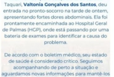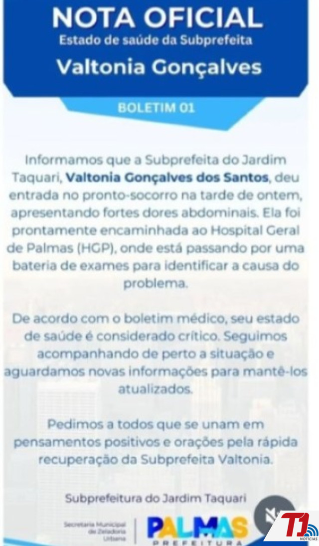 Em nota oficial, a Subprefeitura do Jardim Taquari, informa que a subprefeita Valtonia Gonçalves dos Santos foi internada na noite desta quinta-feira, 24, no Hospital Geral de Palmas (HGP), com fortes dores abdominais e que passa por uma série de exames para identificar a causa do problema. Conforme a Subprefeitura de Taquari, Boletim Médico do HGP informou que o estado de saúde da paciente é crítico. A nota pede orações pela restauração da saúde da subprefeita e informa que novas atualizações sobre o quadro de saúde dela serão divulgadas oportunamente.