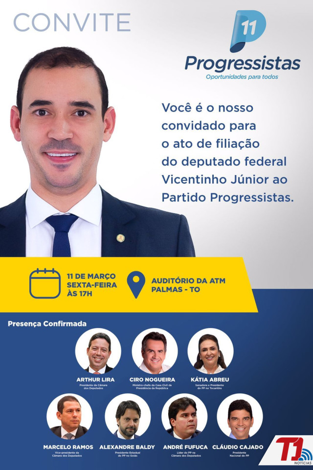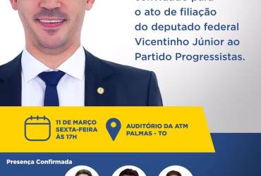 O deputado federal Vicentinho Júnior se filia ao Partido Progressistas (PP) nesta sexta-feira, 11 de março, às 17h, no auditório da Associação Tocantinense de Municípios (ATM), em Palmas. O evento de filiação contará com a presença de diversas autoridades políticas, como o presidente da Câmara dos Deputados, Arthur Lira, Ministro-chefe da Casa Civil da Presidêncida da República, Ciro Nogueira, senadora e presidente do PP no Tocantins, Kátia Abreu, vice-presidente da Câmara dos Deputados, Marcelo Ramos, Presidente estadual do PP no Goiás, Alexandre Baldy, líder do PP na Câmara, André Fufuca, e Cláudio Cajado, presidente nacional do PP.