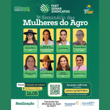 No dia 16 de maio, o Sistema Faet/Senar promoverá o 3º Seminário das Mulheres do Agro, durante a programação da Agrotins 2025, em Palmas (TO). O evento acontecerá no auditório do Sistema Faet e contará com o painel “O Desafio de Lidera...