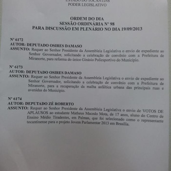 Em sessão ordinária realizada na manhã desta quinta-feira, 19, apenas três requerimentos foram colocados em discussão para a ordem do dia, entre eles uma solicitação de aplausos de autoria do deputado José Roberto (PT). Os outros dois, solici...