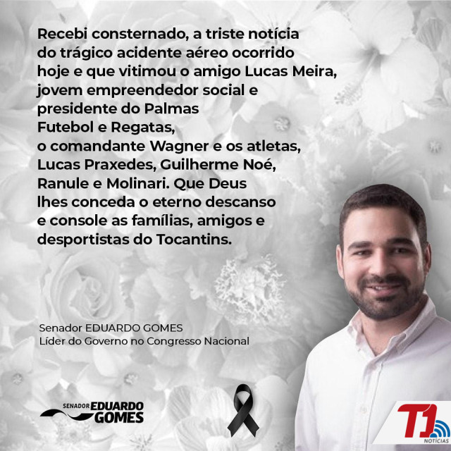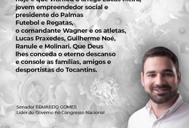 Com profunda tristeza, recebi a notícia trágica do acidente aéreo que ceifou a vida do presidente do Palmas Futebol e Regatas, Lucas Meira; dos atletas Lucas Praxedes, Guilherme Noé, Ranule, Marcus Molinari e ainda do piloto, comandante Wagner, ocorrido na manhã deste domingo, 24.