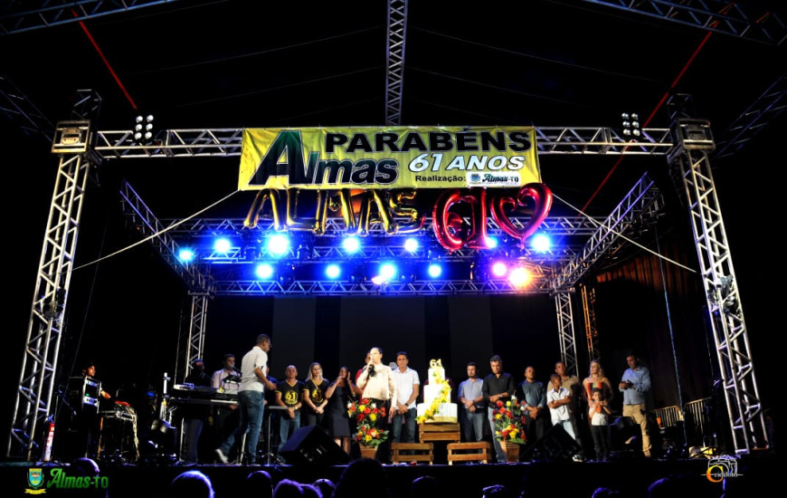 Almas completa 61 anos neste dia 14 de novembro. Já se aproximava da meia noite quando a Banda Municipal subiu ao palco. Autoridades e comunidade se uniram em uma só voz, para cantar o hino da cidade e os parabéns para a cidade, que tem se tornado referência no Sudeste do Tocantins.