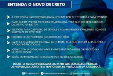 Segundo o decreto, as visitas às praias poderão ocorrer todos os dias das 8h às 19h. Para ter uma tenda instalada será preciso fazer um cadastro na Secretaria Municipal de Turismo e receber um código de controle. As estruturas precisam respeitar um distanciamento de 10 metros das demais e serão permitidas no máximo 10 pessoas por tenda.