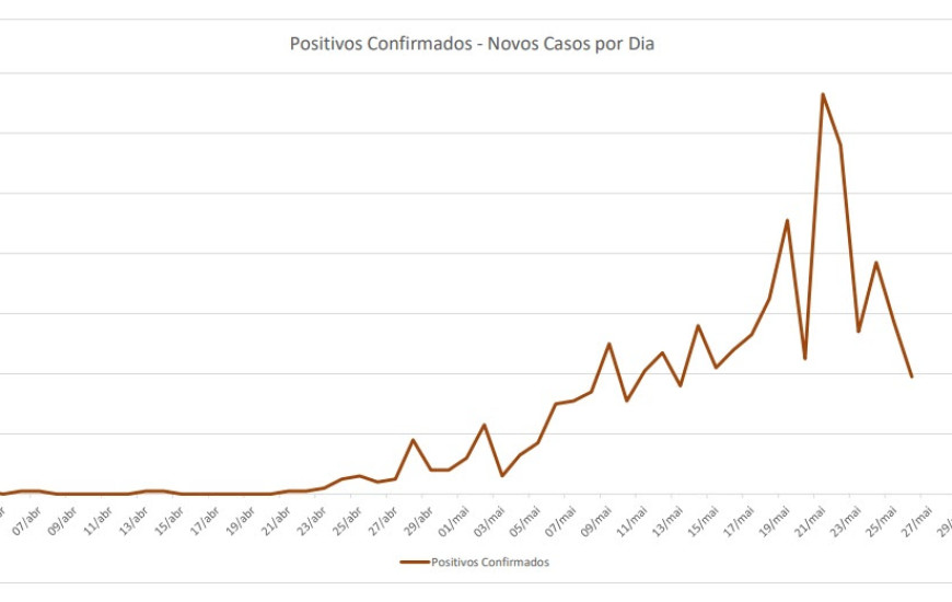 No dia 22 de maio, após o pico no número de casos, os registros foram de 116 novas confirmações. No dia 23, foram 54 novos casos da doença, dando uma subido para 77 no dia 24, mas voltando a cair no dia 25, com 57 confirmações para covid-19.