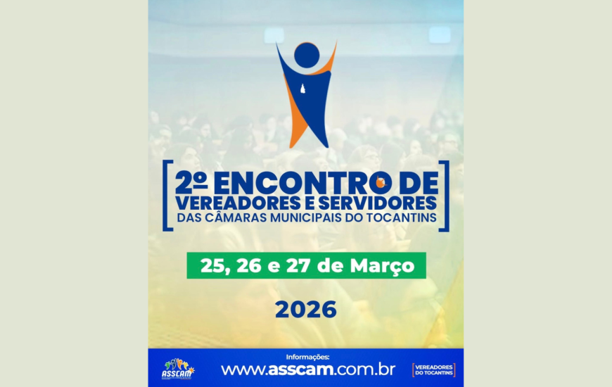 A Associação das Câmaras Municipais do Tocantins (Asscam) realizará, nos dias 26 e 27 de março, em Palmas, o 2º Encontro de Vereadores e Servidores das Câmaras Municipais. O evento tem como objetivo promover o aprimoramento técnico e o fortalecimento do Legislativo municipal por meio da integração entre parlamentares e servidores das Casas de Leis.
