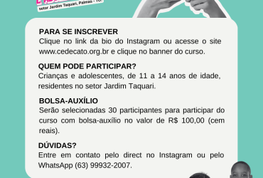 Mais informações, o edital completo e os resultados do processo seletivo estão disponíveis no site www.cedecato.org.br e no Instagram @cedecato. Dúvidas podem ser esclarecidas pelo WhatsApp (63) 99932-2007.