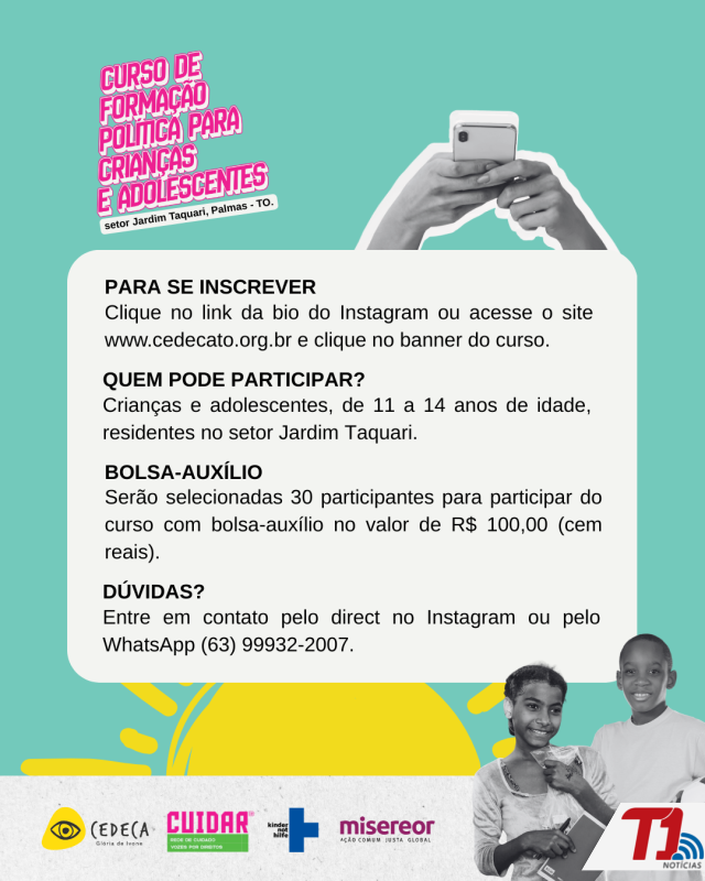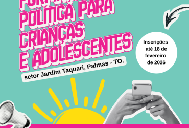 O Centro de Defesa dos Direitos da Criança e do Adolescente Glória de Ivone (CEDECA/TO) abriu processo seletivo para crianças e adolescentes de 11 a 14 anos, moradores do setor Jardim Taquari, em Palmas (TO). Ao todo, estão sendo ofertadas 30 vagas para 5ª turma do Curso de Formação Política para Crianças e Adolescentes, iniciativa do Projeto Vozes por Direitos. As inscrições estarão abertas no período de 26 de janeiro a 18 de fevereiro de 2026, por meio do Google Forms.