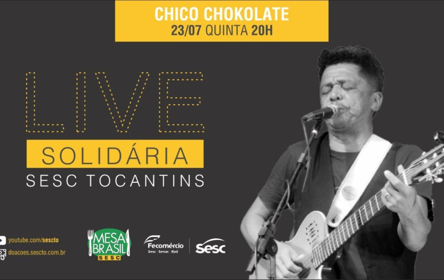 Solidariedade e versatilidade rimam na vida e na arte. Prova disso será a segunda Live Solidária Sesc Tocantins, que o Sistema Fecomércio Tocantins, por meio do Mesa Brasil Sesc, realizará com o show “Versátil”, do cantor e compositor Chico Chokolate, no dia 23 de julho e que será transmitida a partir das 20h no canal do YouTube do Sesc Tocantins, no link https://www.youtube.com/sescto, direto do Teatro Sesc Palmas, do Centro de Atividades que fica na 502 Norte. Ação sociocultural tem como objetivo arrecadar alimentos não perecíveis e materiais de higiene pessoal e de limpeza para serem distribuídos gratuitamente às pessoas em situação de vulnerabilidade social em todo o Estado. O link para doações é https://doacoes.sescto.com.br/. Informações pelos telefones (63) 3212-9976 e 9 8400-5595.
