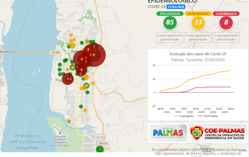 Passou a operar na manhã deste sábado, 28, o Painel Epidemiológico Covid-19, que é o acompanhamento georreferenciado de todas as notificações de possíveis infecções pelo novo coronavírus no município de Palmas. A plataforma, desenvolvida pelo Núcleo de Tecnologia da Secretaria Municipal de Saúde (NUT/Semus), atualiza diariamente casos investigados (cor amarela), descartados (cor verde) e confirmados (cor vermelha), distribuídos no mapa da Capital.