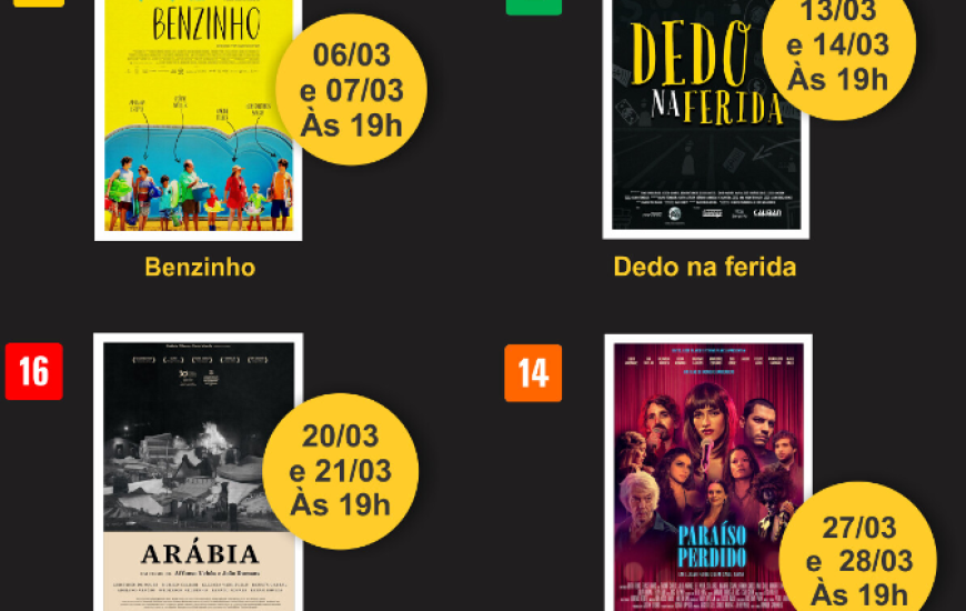 As sessões acontecerão sempre aos finais de semana, nas sextas-feiras e sábados, às 19h, com entrada gratuita e a classificação variando de livre a 16 anos.