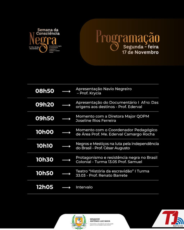 Com o tema “Consciência negra é reconhecer, respeitar e celebrar nossas raízes”, o Colégio Militar Senador Antônio Luiz Maya realiza de 17 a 19 de novembro sua Semana da Consciência Negra, em Palmas.