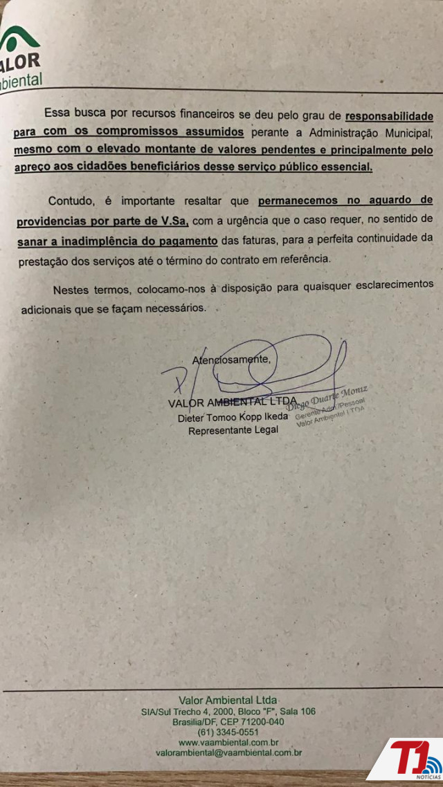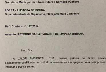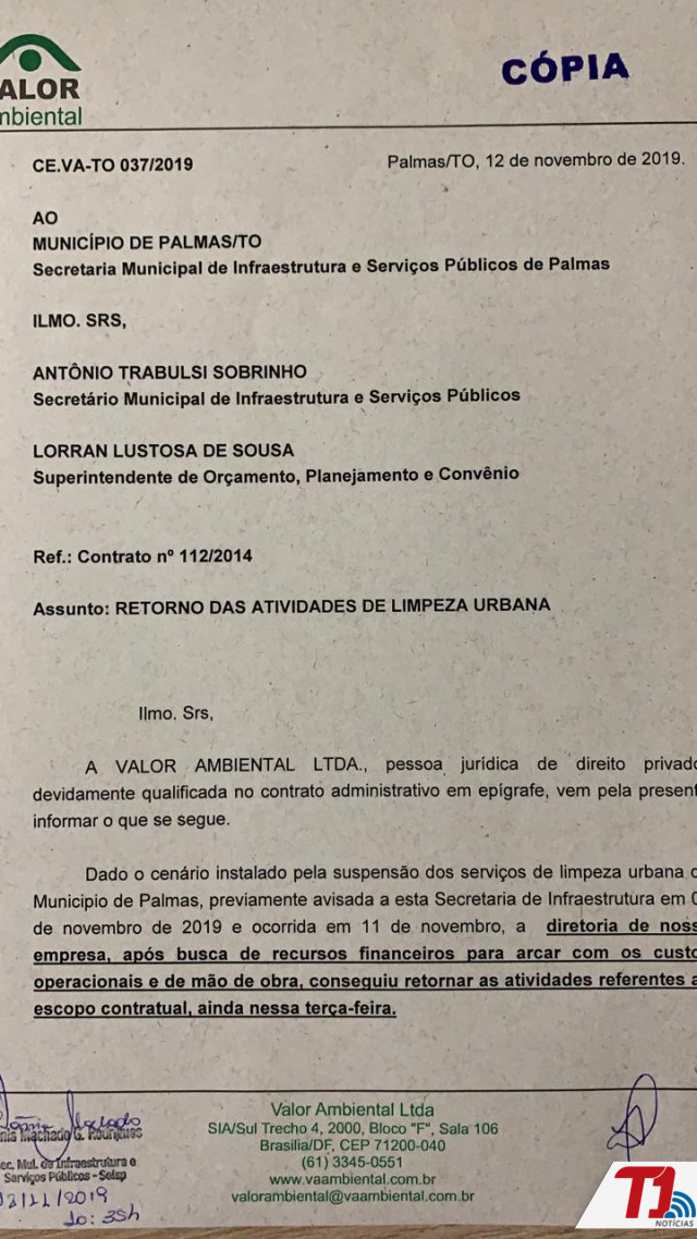 A Valor Ambiental já havia recebido do 'Sindicato dos Trabalhadores em empresas de Asseio, Conservação Ambiental e Pública do Estado do Tocantins' (Sintecap-TO) uma notificação para quitar o restante da folha de pagamento do seu quadro de funcionários.