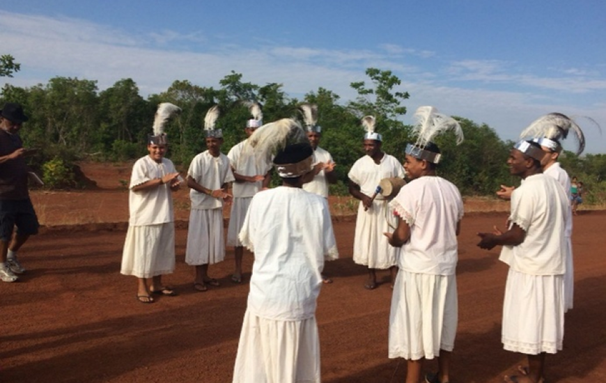 As roupas da comunidade seguem o modelo original, são elas que caracterizam os homens que dançam durante o festejo. As vestimentas são brancas e feitas de saco de estopa. As peças utilizadas na cintura são saiotes com comprimento abaixo do joelho, as camisas são de manga curta e, na cabeça, um adorno feito com penas de ema (essas peças são guardadas há décadas e reaproveitada ano após ano), em forma de arco, de cor prata, simbolizando uma coroa.