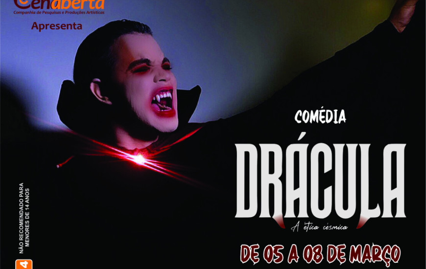 A mais famosa história de vampiros da literatura e do cinema, ‘Drácula’ acaba de ganhar mais uma adaptação palmense para os palcos do teatro. A comédia teatral é o próximo espetáculo do repertório da Cia de Teatro Cenaberta, que entra em cartaz no Theatro Fernanda Montenegro, de 05 a 09 de março deste ano.