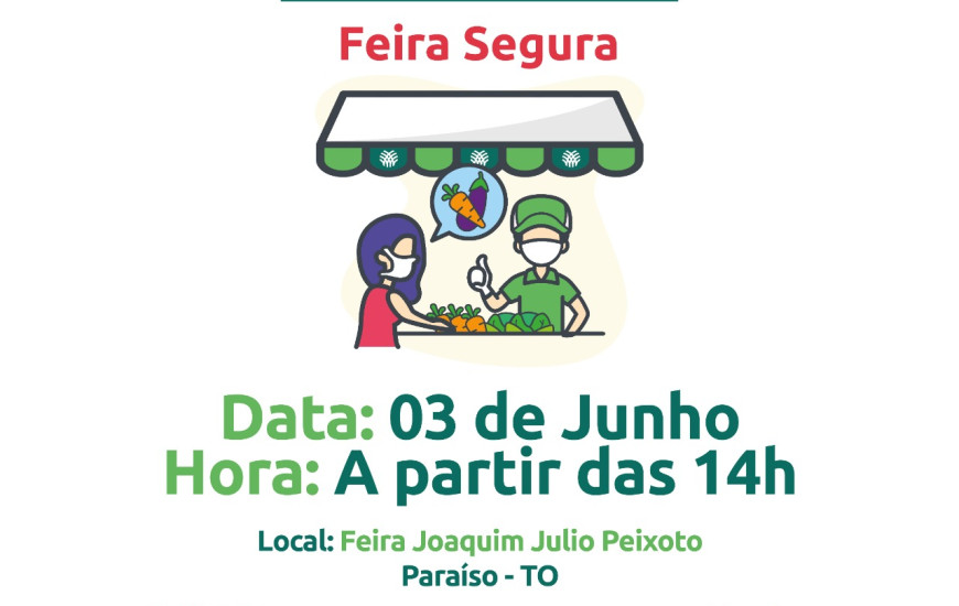 Mais uma edição do projeto Feira Segura será realizada nesta quarta-feira, 3. Desta vez, a feira acontecerá no município de Paraíso, a partir das 14 horas, na Feira Joaquim Júlio Peixoto. O objetivo do projeto é viabilizar o escoamento da produção agropecuária para garantir o abastecimento de alimentos à população, atendendo as normas de segurança e higiene. Com apoio do Sebrae Tocantins, a iniciativa é realizada pelo Serviço Nacional de Aprendizagem Rural (SENAR/TO) e a Confederação Nacional da Agricultura (CNA).