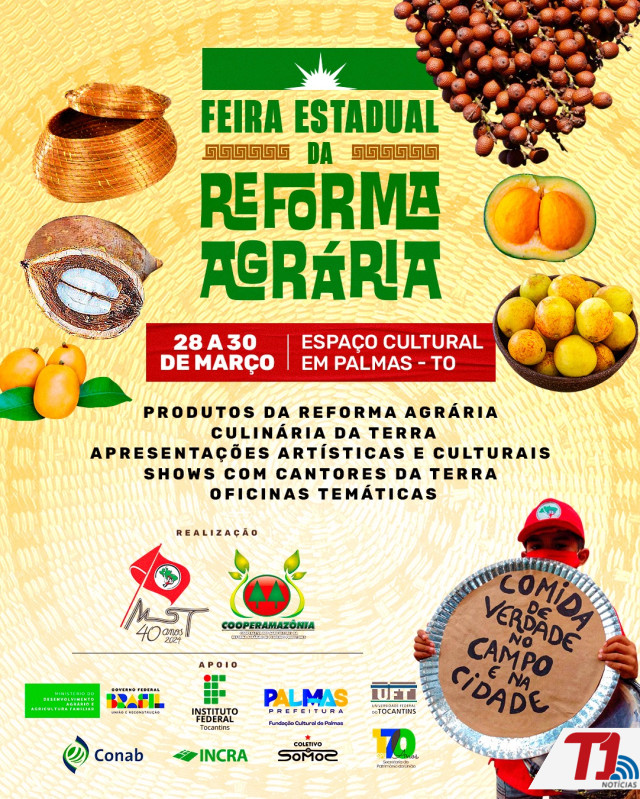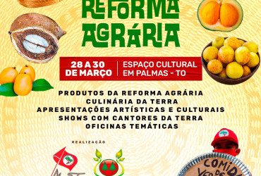 O Espaço Cultural José Gomes Sobrinho, em Palmas, recebe a partir desta sexta-feira, 28, a Feira Estadual da Reforma Agrária no Tocantins. A abertura oficial do evento está marcada para às 19 horas e ainda terá apresentação cultural a partir das 21 horas do cantor Dorivã, o “passarim do Jalapão”. A feira vai até domingo, 30, e sua programação inclui exposição de produtos da agricultura familiar e campesina, culinária da terra, apresentações artísticas e culturais, shows e oficinas temáticas.
