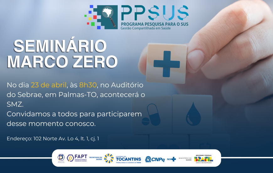 Ocorre nesta quinta-feira, 23, às 8h30, no auditório do Sebrae, em Palmas, o Seminário Marco Zero do Programa Pesquisa para o SUS: Gestão Compartilhada em Saúde (PPSUS). O encontro, realizado pela Fundação de Amparo à Pesquisa do Tocantins (Fapt), reunirá pesquisadores, gestores, comunidade acadêmica e instituições parceiras para discutir propostas e estudos voltados aos principais desafios da saúde pública no estado.