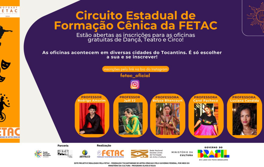 A Federação Tocantinense de Artes Cênicas (Fetac) está com inscrições abertas para o Circuito Estadual de Formação Cênica, que será realizado neste mês de novembro em Miracema, Paraíso do Tocantins, Gurupi e Tocantinópolis. O projeto oferece oficinas gratuitas de Teatro, Dança e Circo para pessoas acima de 16 anos.