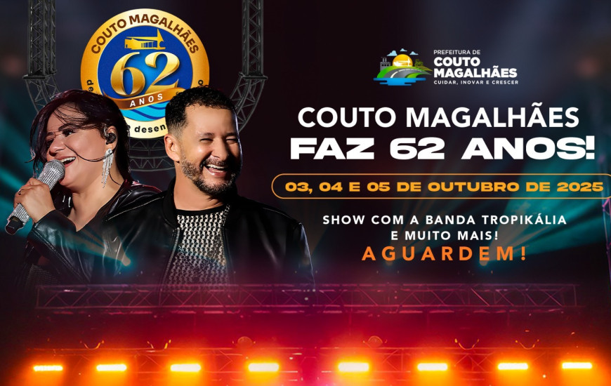 O 62° aniversário de Couto Magalhães promete envolver a cidade num clima de celebração a vida e a cultura. Comemorado em 2025 nos dias 3, 4 e 5 de outubro o aniversário da cidade tem programação preparada especialmente para seus moradores e visitantes. A festa ocorre por conta da Prefeitura de Couto Magalhães, sob a gestão do prefeito Júlio César Brasil.
