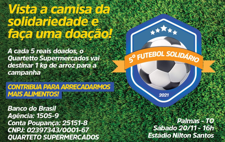 A 5ª edição do Futebol Solidário, acontece neste sábado, 20, às 16h, no estádio Nilton Santos, em Palmas. O campeonato promete reunir estrelas do esporte, artistas e políticos que apoiam a causa. A entrada é um quilo de alimento não-perecível, que será distribuído para entidades que ajudam famílias carentes no Tocantins.